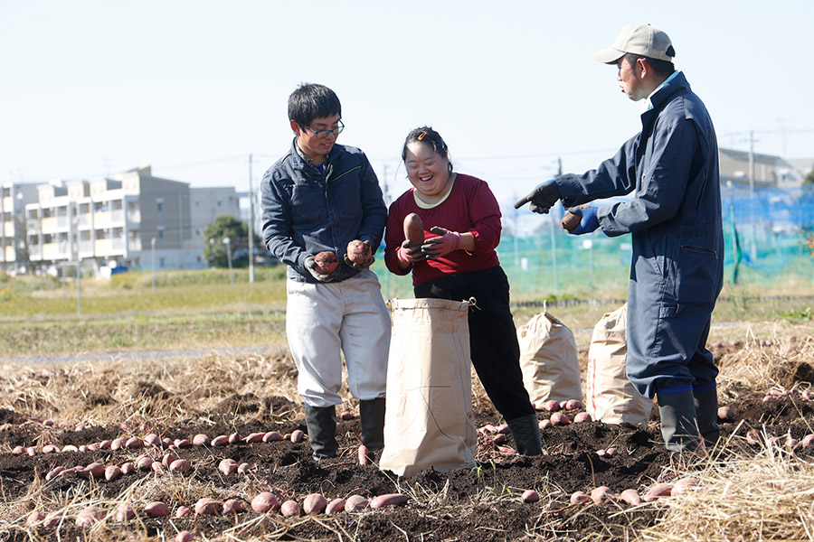 就労継続支援である「就労支援センター北勝園みなと館」は障がいを持つ方を対象に、就労に必要な知識の獲得や能力の向上をサポートしています。北水会ファーム(西十三奉行)での農作物の生産、農作物の加工(干し芋づくりなど)の生産活動やリサイクル活動、野菜やパンの販売活動に「仕事」として従事し、生を生きとした生活を送れるよう活動しています。